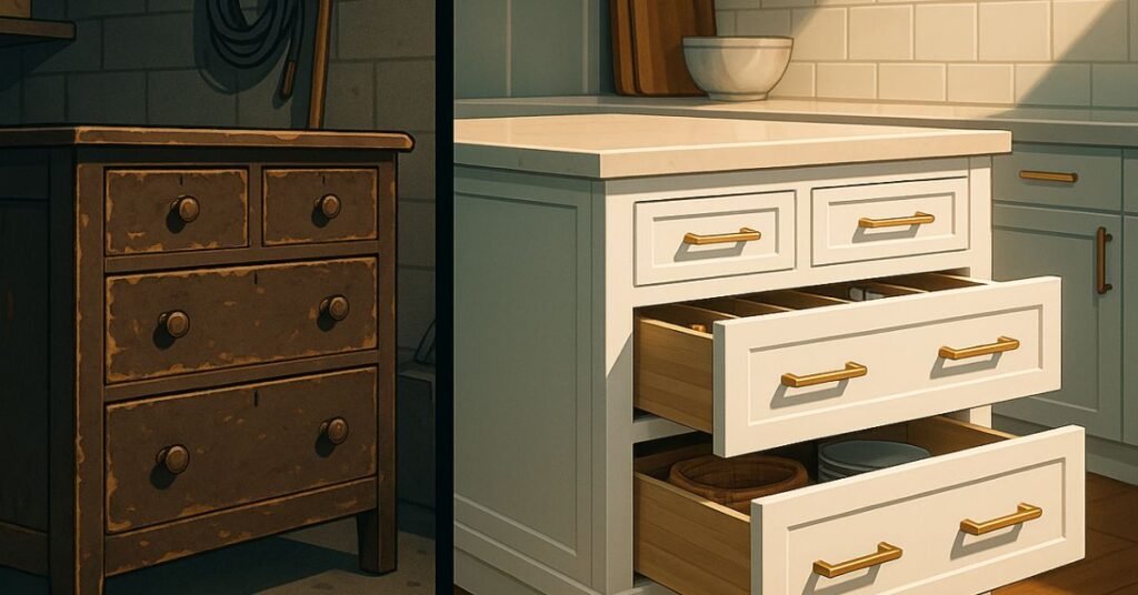 By upcycling a broken dresser into kitchen storage, you’re making an eco-conscious choice. We decided to pull a vintage dresser from the garage and give it new life. Repurposing furniture reduces waste and promotes sustainable living. This helps in kitchen organization and adds a unique piece of furniture to your home.