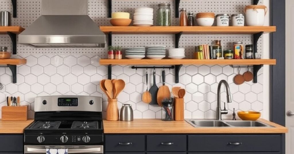 | Pegboard | Pots, pans, kitchen tools, shelves |